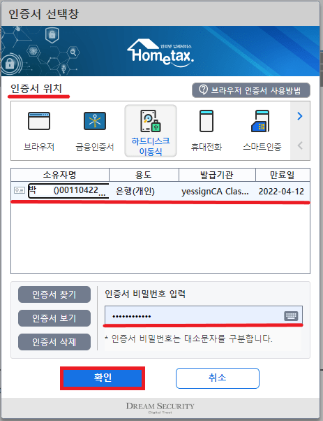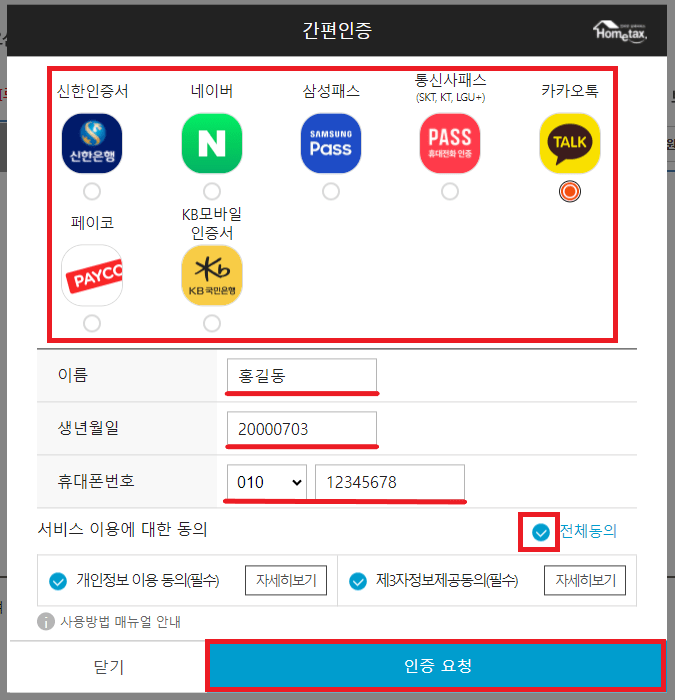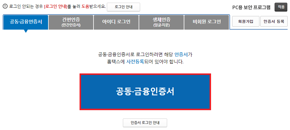 국세청 홈택스 서비스를 이용하기 위해서는 공동·금융인증서 및 간편 인증(카카오톡, 통신사 패스, 페이코, 삼성 패스, KB 모바일,, 네이버, 신한은행)등 을 선택하여 로그인을 진행할 수 있습니다. 공동·금융인증서로 로그인 시 해당 인증서가 홈택스에 사전등록이 되어 있어야 로그인이 가능하니 참고하시기 바랍니다.