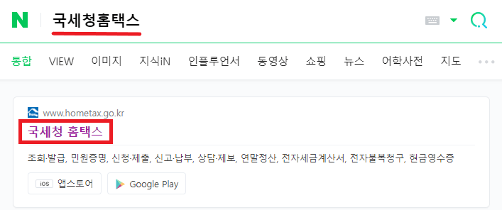첫 번째로 자주 이용하는 포털 사이트 검색창에 '국세청 홈택스' 입력하고 검색된 '국세청 홈택스'를 눌러 주세요.