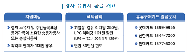 코로나19 등으로 경제적 어려움을 겪고 있는 중산서민·자영업자 등의 유류비 부담을 덜어주고 에너지 절약을 유도하기 위해 '22년부터 경차 연료의 유류세 환급하는 제도로 올해부터 경차 유류비 지원한도액을 연간 20만 → 30만 원 상향 조정하였습니다. 이로 인해 가정에 경차를 보유하고 있다면 유류세 환급제에 따라 1년에 최대 30만 원의 기름값을 환급받을 수 있습니다. 만약 경승용차와 경승합차를 1대씩 갖고 있다면 2대 모두 각각 30만 원이 환급 가능합니다.
