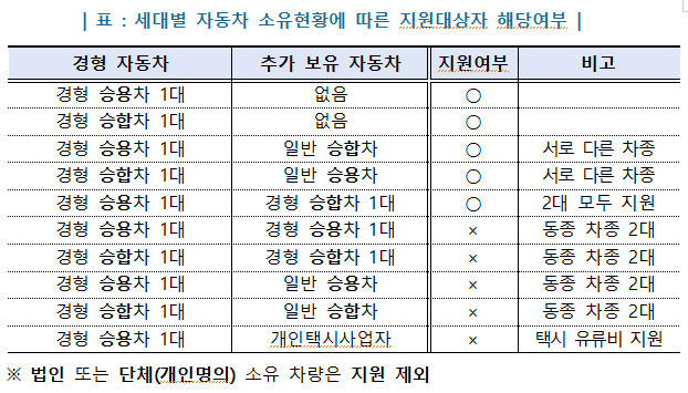 ㅇ 경형자동차 소유자와 주민등록표상 동거가족이 소유한 승용자동차 또는 승합자동차 각각의 합계가 1대만 보유하고 있어야 합니다. '경형 승용차-일반 승합차' '경형 승합차-일반 승용차' 형태로 승용-승합차가 각 1대인 경우에도 가능하며, 경형 승용차와 일반 승용차를 보유하거나, 경형 승합차와 일반 승합차를 보유한 가구는 지원대상에서 제외됩니다.