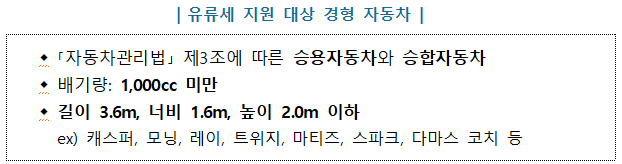 ▶ 1가구 1 경차 소유자 유류 구매 시 휘발유·경유 : 리터당 교통·에너지·환경세 250원, LPG는 리터당 개별소비세 161원(4월 30일까지는 128원)을 연 30만 원까지 환급하는 제도