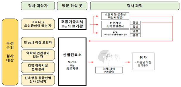 ※ 단, 우선순위 검사 대상 아닌 경우는 코로나19 검사를 시행하는 의료기관 선별 진료소 및 일반 병·의원에서도 PCR 검사를 받으 실 수 있느냐, 병원이 책정하는 기준에 따라 해당 비용을 지불하셔야 합니다.