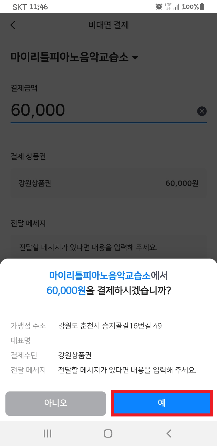 결제하시겠습니까? 창이 뜨면 결제할 내역을 다시 한번 확인하고 '예'를 눌러 주세요.