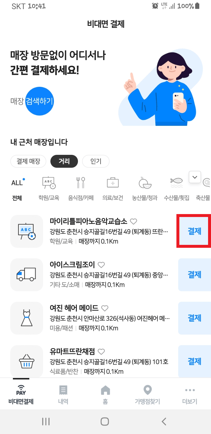 거리를 눌러보면 현재 내가 있는 곳을 기준으로 비플제로페이 비대면 결제가 가능한 매장이 검색되며, 방금 ALL(전체)에서 검색되었던 음악교습소 학원도 확인 됩니다.