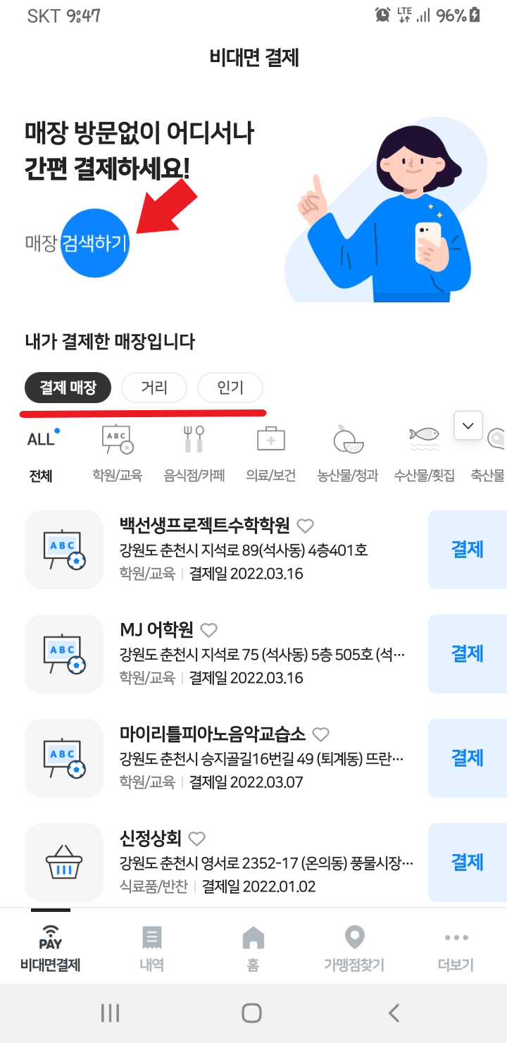 매장 검색하기는 돋보기 옆에 검색창에 매장 상호명을 입력하면 주변에 있는 비대면 결재 매장이 검색됩니다. 매장 상호면을 모른다며 몇 글자만 입력해도 자동으로 검색되니 참고해 주세요.