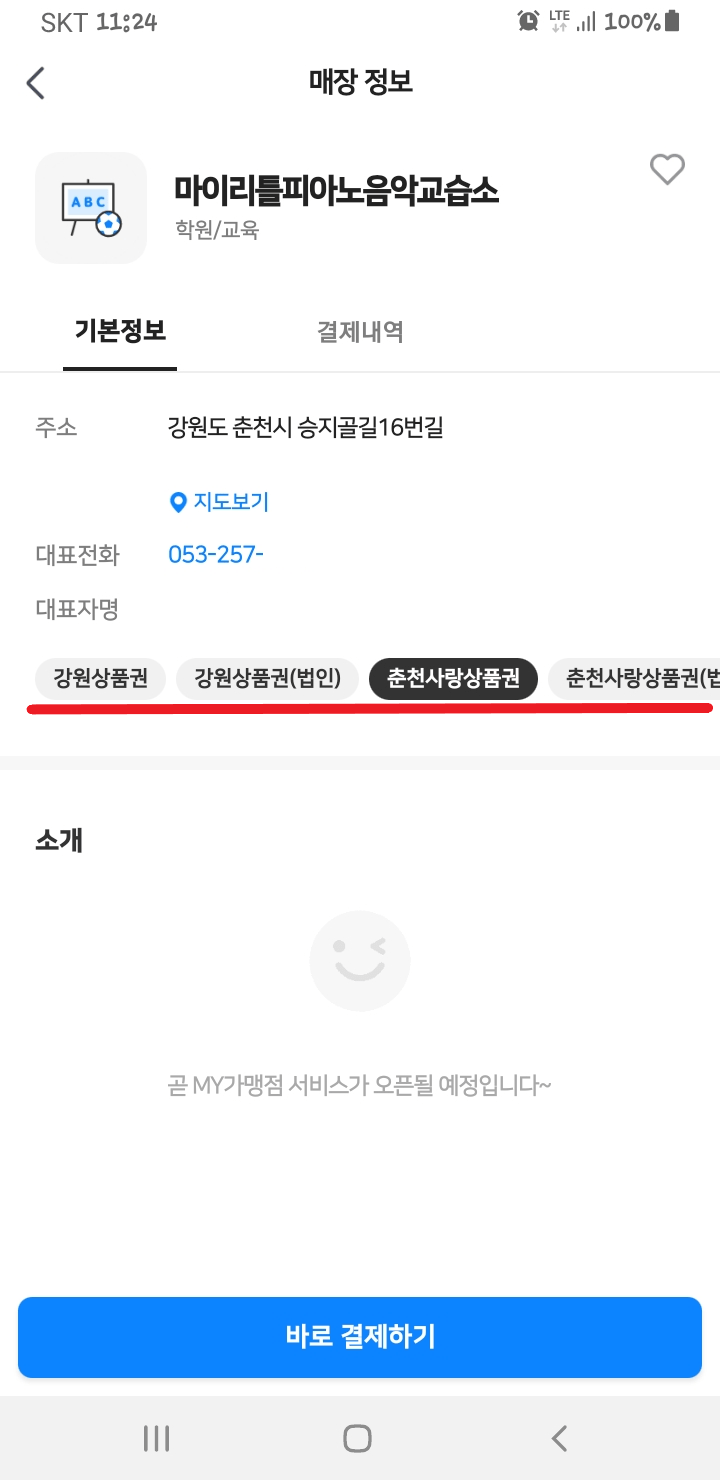 ※ 결제하기 전 결제버튼 옆에 가게에 기본정보를 확인할 수 있습니다. 주소, 전화번호, 영업시간, 가게에서 결제 가능한 상품권을 확인하고 결제해야 합니다. 그리고 결제 전에 '사장님께 전화 확인은 필수!'입니다.