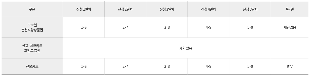 내 출생연도 끝자리에 해당되는 요일을 꼭 확인해 주세요. 그리고 모바일 춘천사랑 상품권은 토~일요일부터는 제한 없이 신청 가능하며 선불카드는 토~일요일은 휴무이니 참고하시기 바랍니다.
