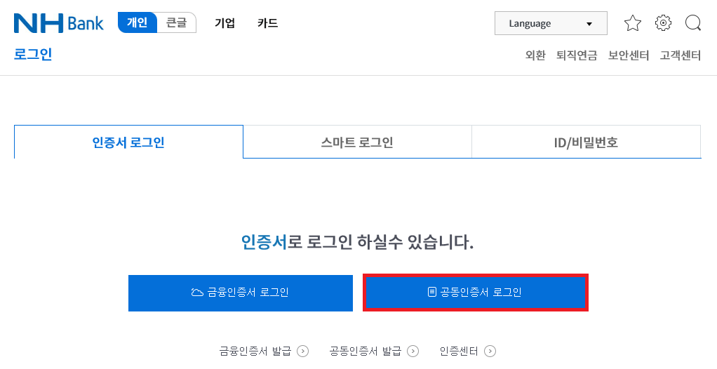 농협은행 서비스를 이용하려면 로그인이 필요합니다. PC에 저장되어 있는 금융인증서/공동인증서(구 공인인증서)를 통해 로그인을 진행해 주세요. 저는 공동 인증서를 눌러 진행하도록 하겠습니다.