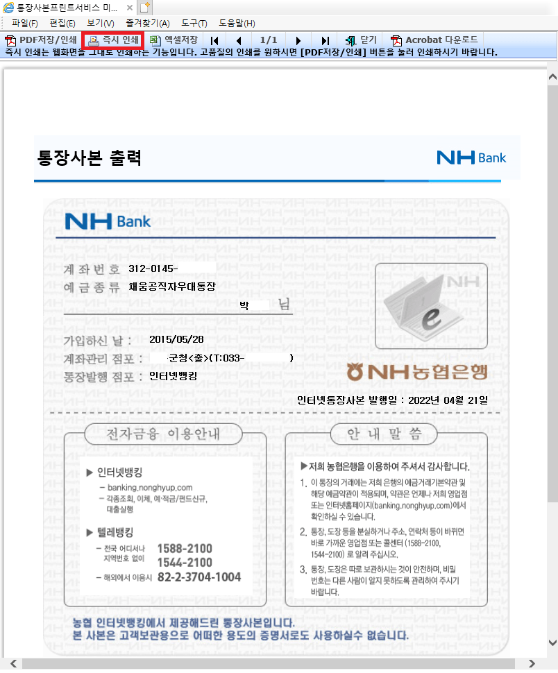 프린터 미리 보기 팝업창에서 '즉시 인쇄'를 눌러 농협 통장사본을 출력하면 완료됩니다.