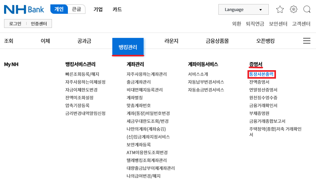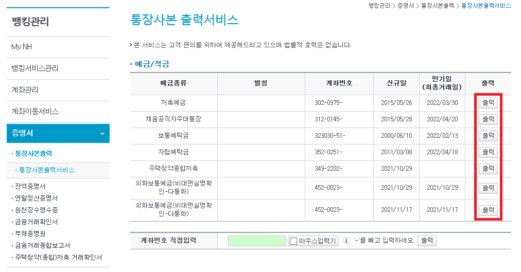■ 농협 통장사본 출력 방법