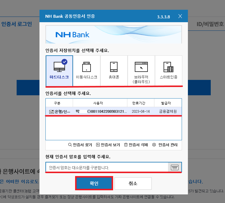 이제 공동 인증서가 저장되어 있는 위치를 선택하고 인증서의 비밀번호를 입력 후 '확인'을 눌러 주세요.