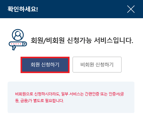 정부24 민원 서비스를 이용하기 위해서는 로그인이 필요합니다. '회원 신청하기'를 눌러 주세요.