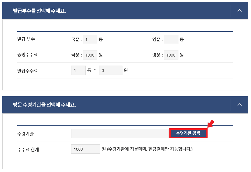 발급 부수에 국문, 영문으로 출력할지 수량을 입력해 주시고 대학교 졸업증명서를 수령할 기관을 선택합니다. 최대한 본인이 찾기 편하거나 까까운 읍·면·동 주민센터를 선택해 주세요. 앞서 알려드렸지만 증명 수수료는 1,000이며, 수령하는 기관에 현금으로 결제해 주세요.