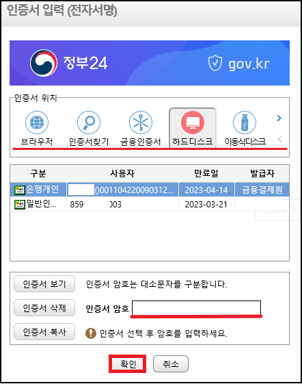 공동 인증서의(구공인인증서)의 위치를 선택해주세요. 선택 후 인증서의 암호를 입력하고 '확인'을 눌러 주세요.