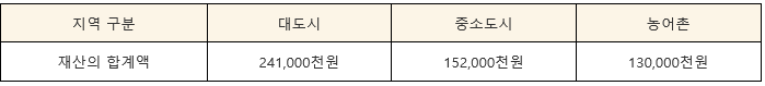 ㅇ 일반 재산(지방세법에 의한 토지, 건축물, 주택, 자동차 등) : 대도시 24,100만 원, 중소도시 15,200만 원, 농어촌 13,000만 원 이하