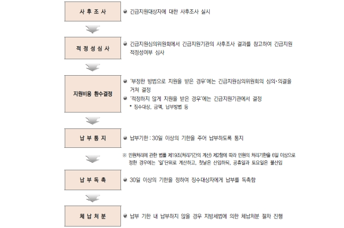 부정한 방법으로 지원을 받은 것으로 밝혀지거나, 긴급 생계지원이 적정하게 않은 것을 결정된다면 긴급지원심의위원회의 결정에 따라 지체 없이 지원은 중단되며 지원한 비용의 전부 또는 일부를 반환해야 합니다.