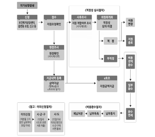 - 시장·군수·구청장은 지원 요청 또는 신고가 있거나 위기상황에 처한 자를 찾아낸 경우 이를 확인하여 지체 없이 지원의 종류 및 내용을 결정하여 지원을 합니다.