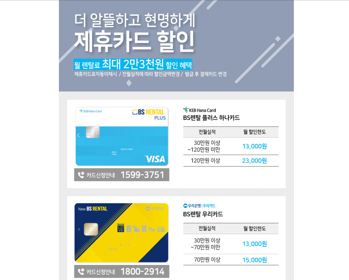 제휴 가능 카드 발급 시 전월 실적 30만 원 사용 시 최대 13,000원, 120만원 사용 시 23,000원 렌탈료 할인을 받을 수 있다고 하니 카드사마다 할인 내용 잘 알아보시고 구매하시는 게 좋을 듯싶습니다.