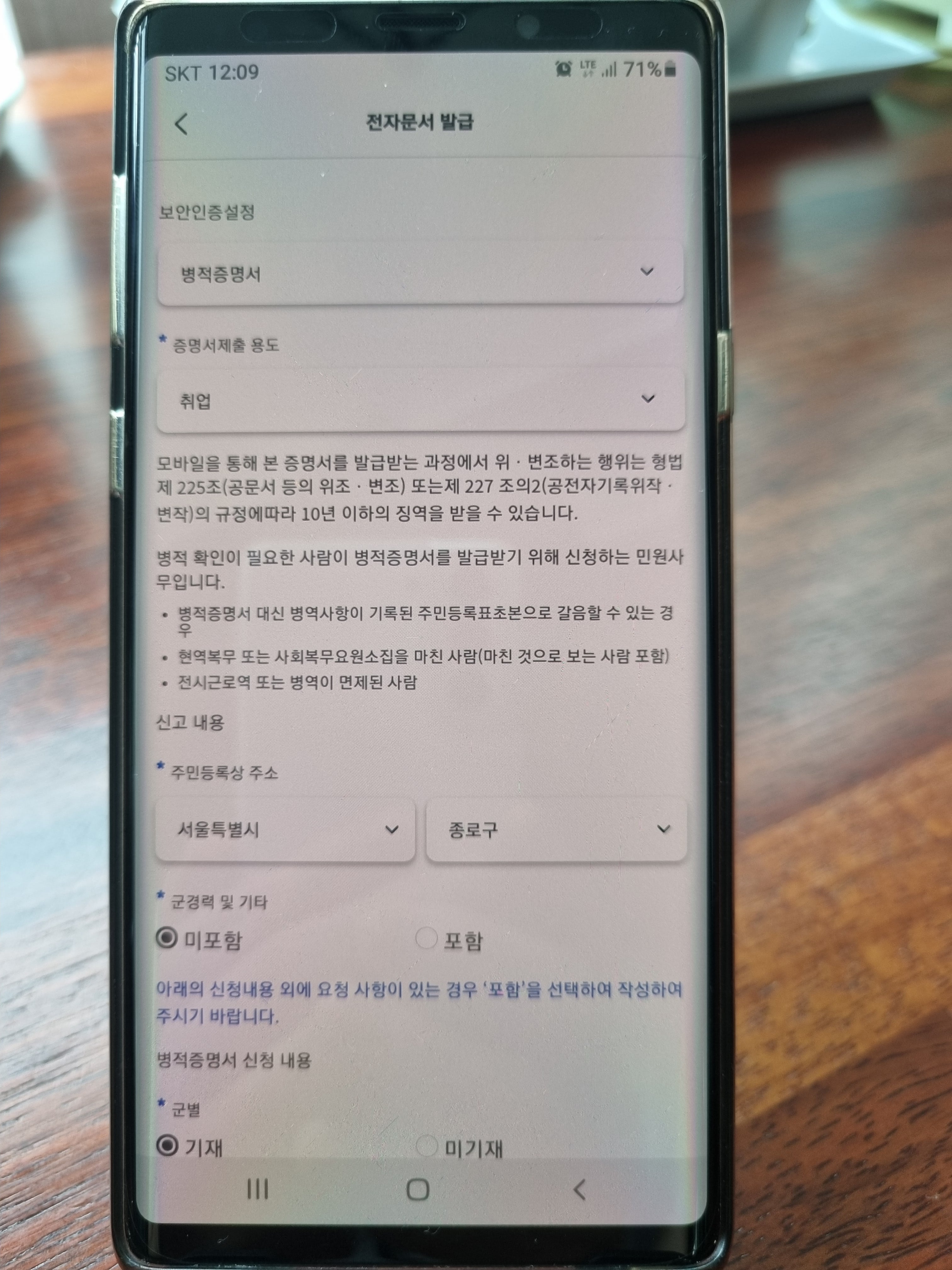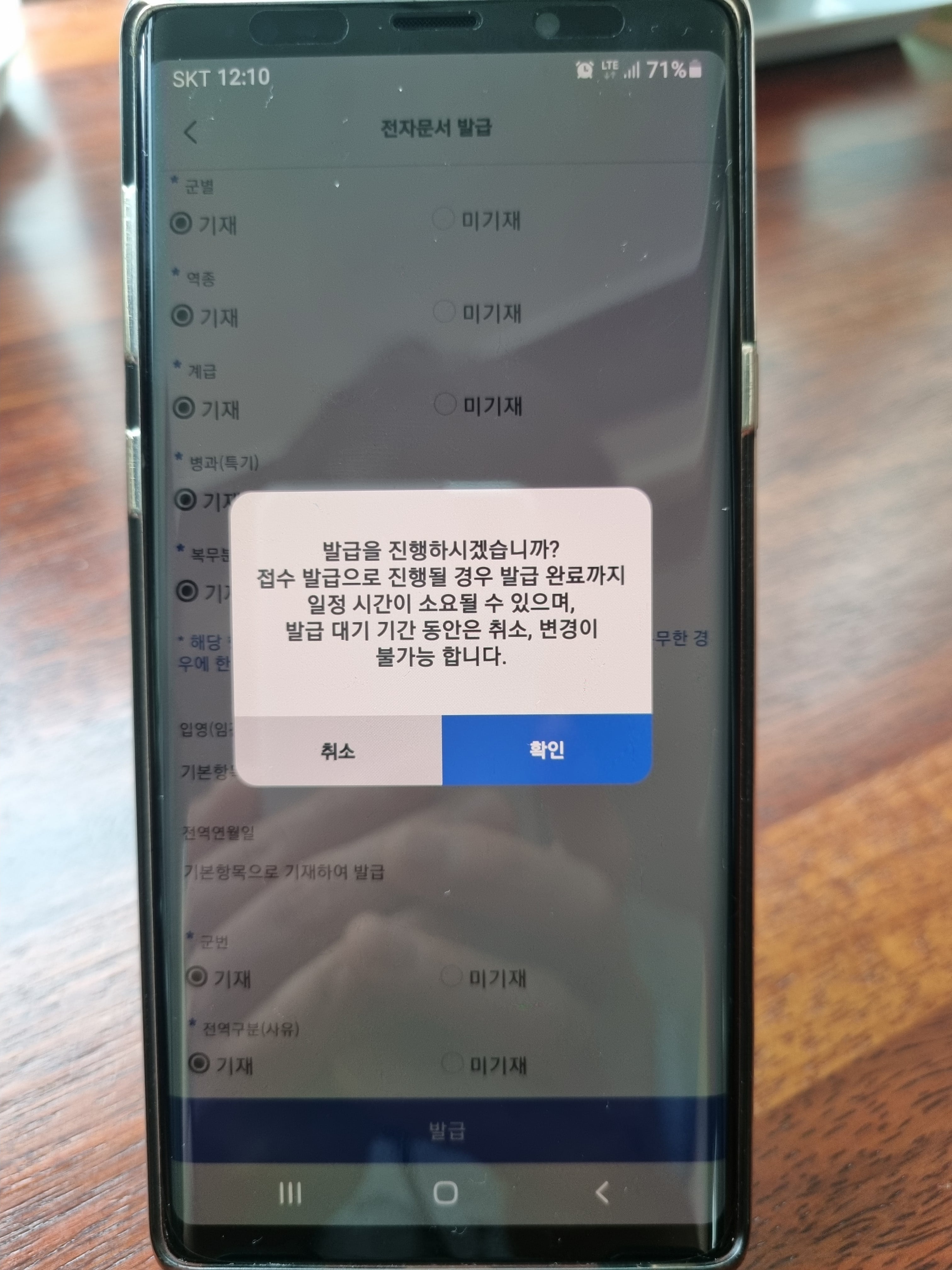 병적증명서 발급을 진행하기 위해 '확인'을 눌러 주세요.