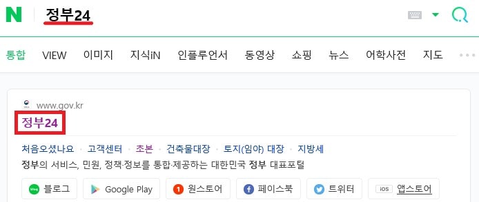 첫 번째로 자주 이용하는 인터넷 검색창에 '정부 24를' 입력하고, 아래 검색된 '정부 24 홈페이'를 눌러 주세요.