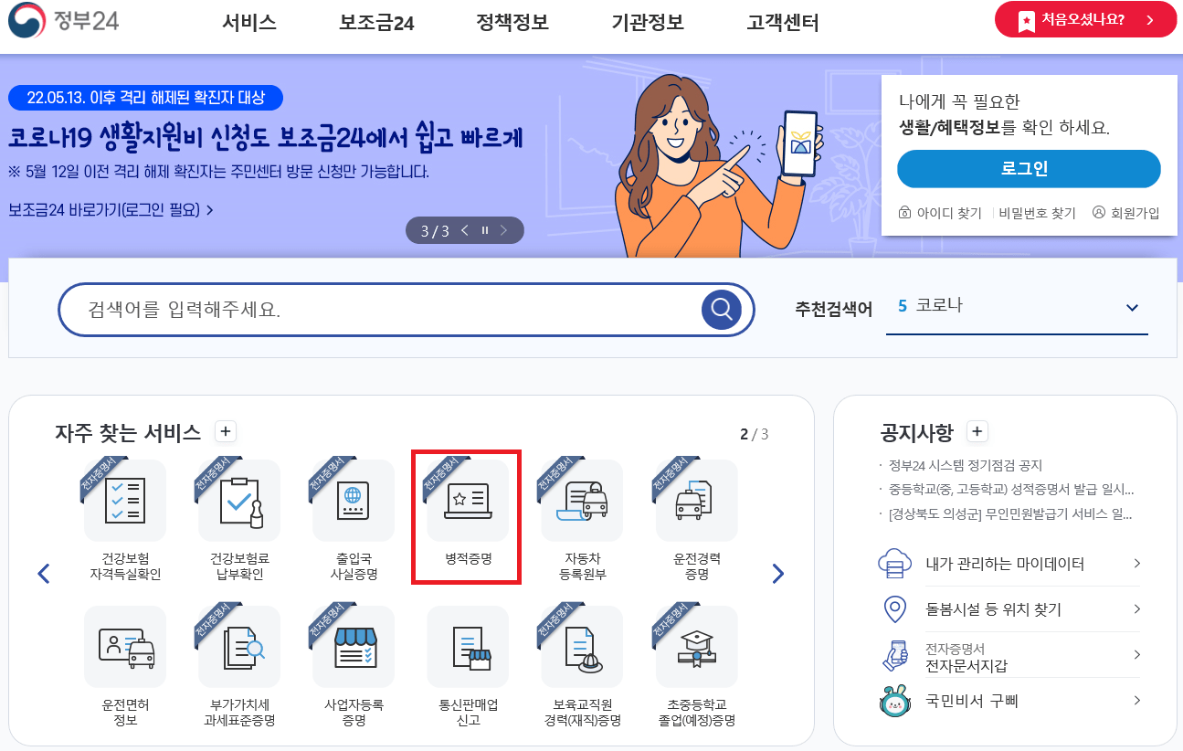 정부 24 홈페이지 접속 후 '자주 찾는 서비스'에서 '병적증명서'를 눌러 줍니다.