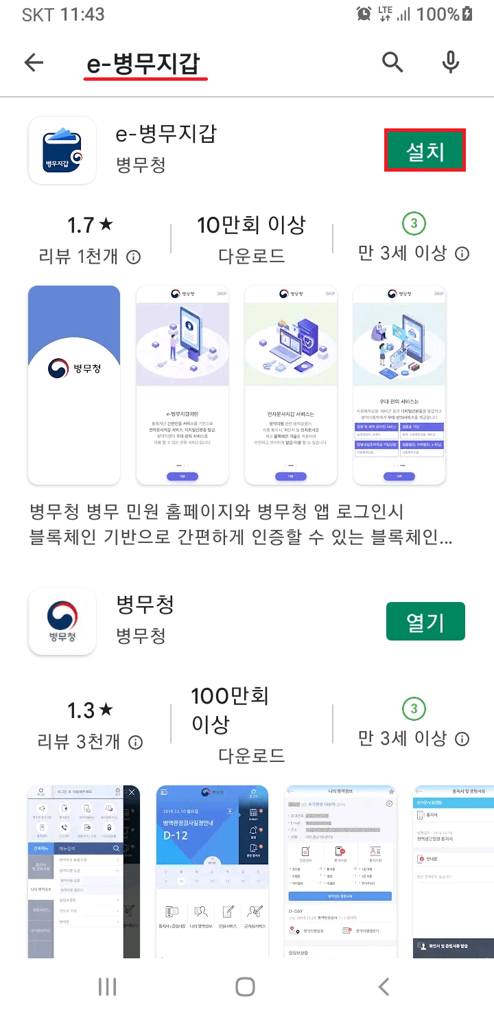 모바일을 통한 병적증명서 발급방법은 첫 번째로 구글 플레이 스토어나 아이폰 앱 스토어에서 검색란에 'e-병무 지갑'을 입력하고 검색해 주세요. 검색 후 e-병무 지갑 앱을 다운로드하기 위해 우측 상단에 '설치'를 눌러 줍니다.
