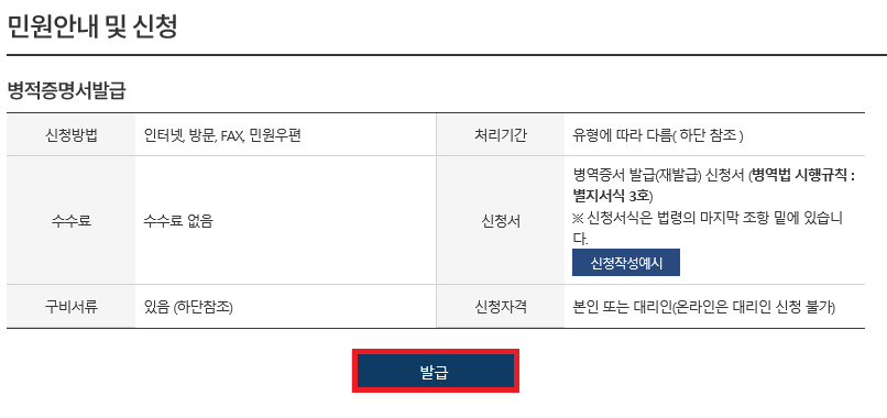 병적증명서 민원안내 및 신청화면으로 신청방법은 인터넷, 방문, FAX, 민원우편 등으로 가능하며 수수료는 무료입니다. 내용을 확인하였다면 아래 '발급'을 눌러 주세요.