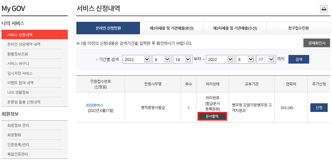 My Gov 나의 서비스 신청내역에서 방금 신청한 병적증명서를 확인할 수 있습니다. 병적증명서를 발급받기 위해 '문서 출력'을 눌러 주세요.