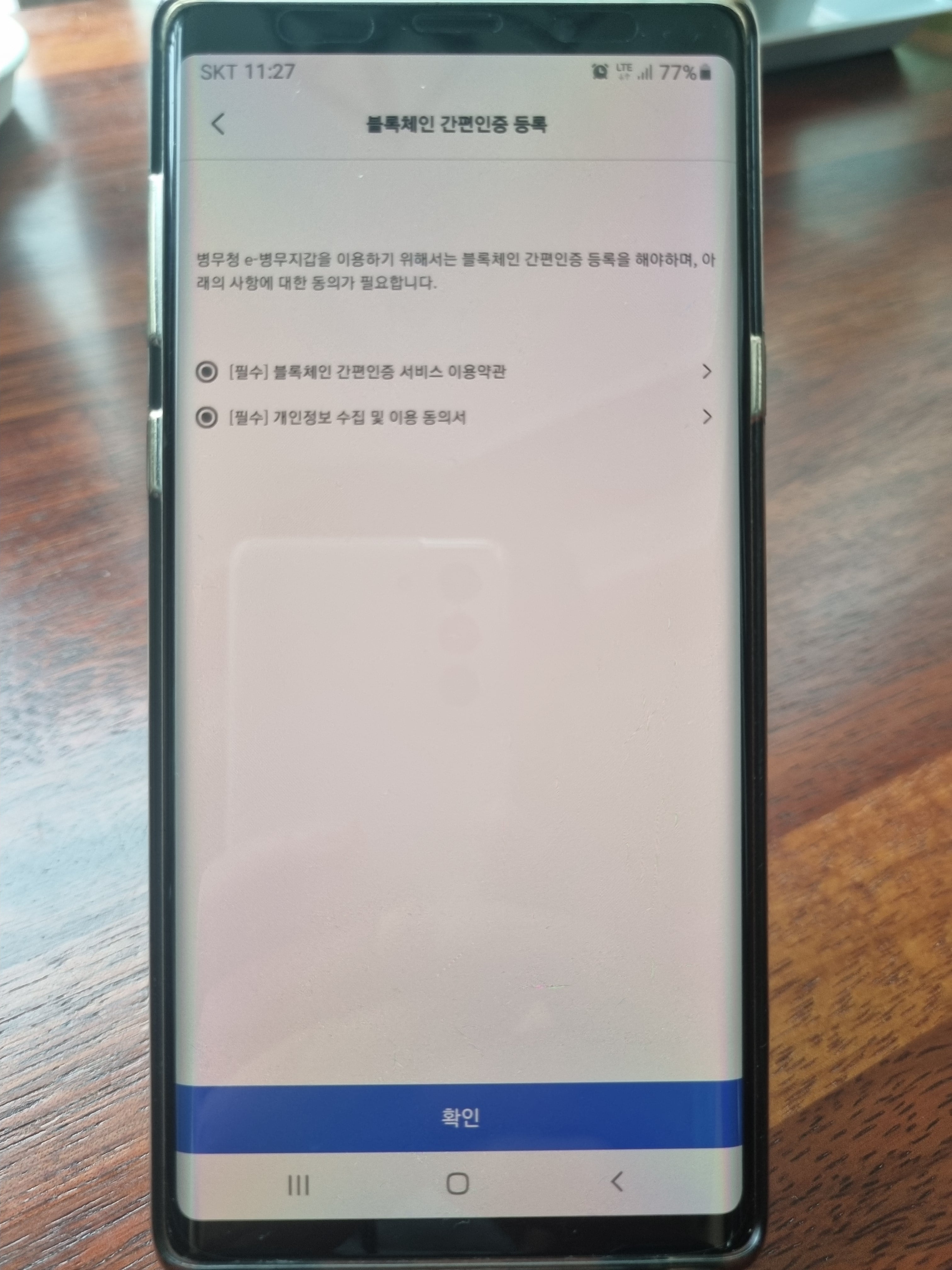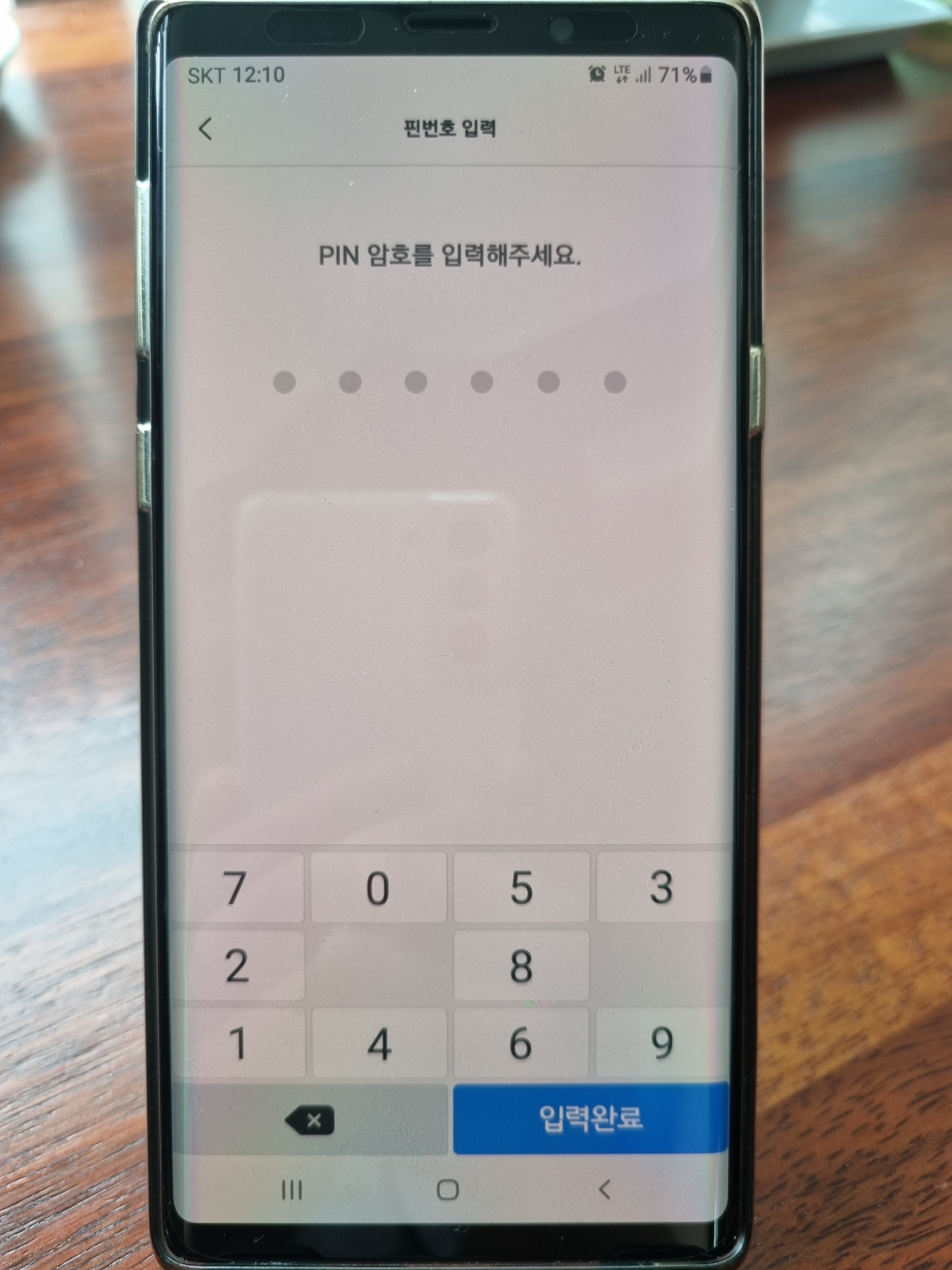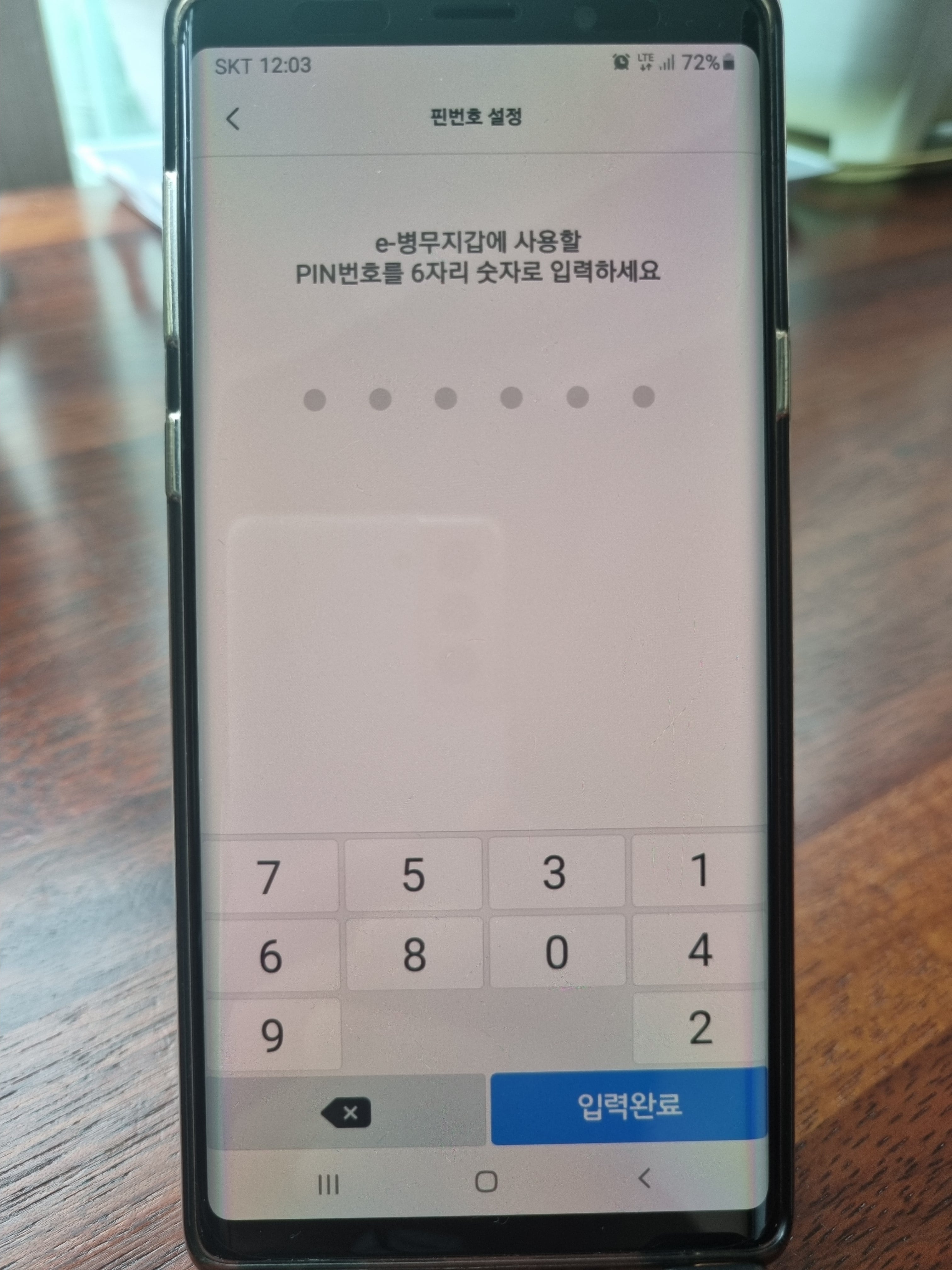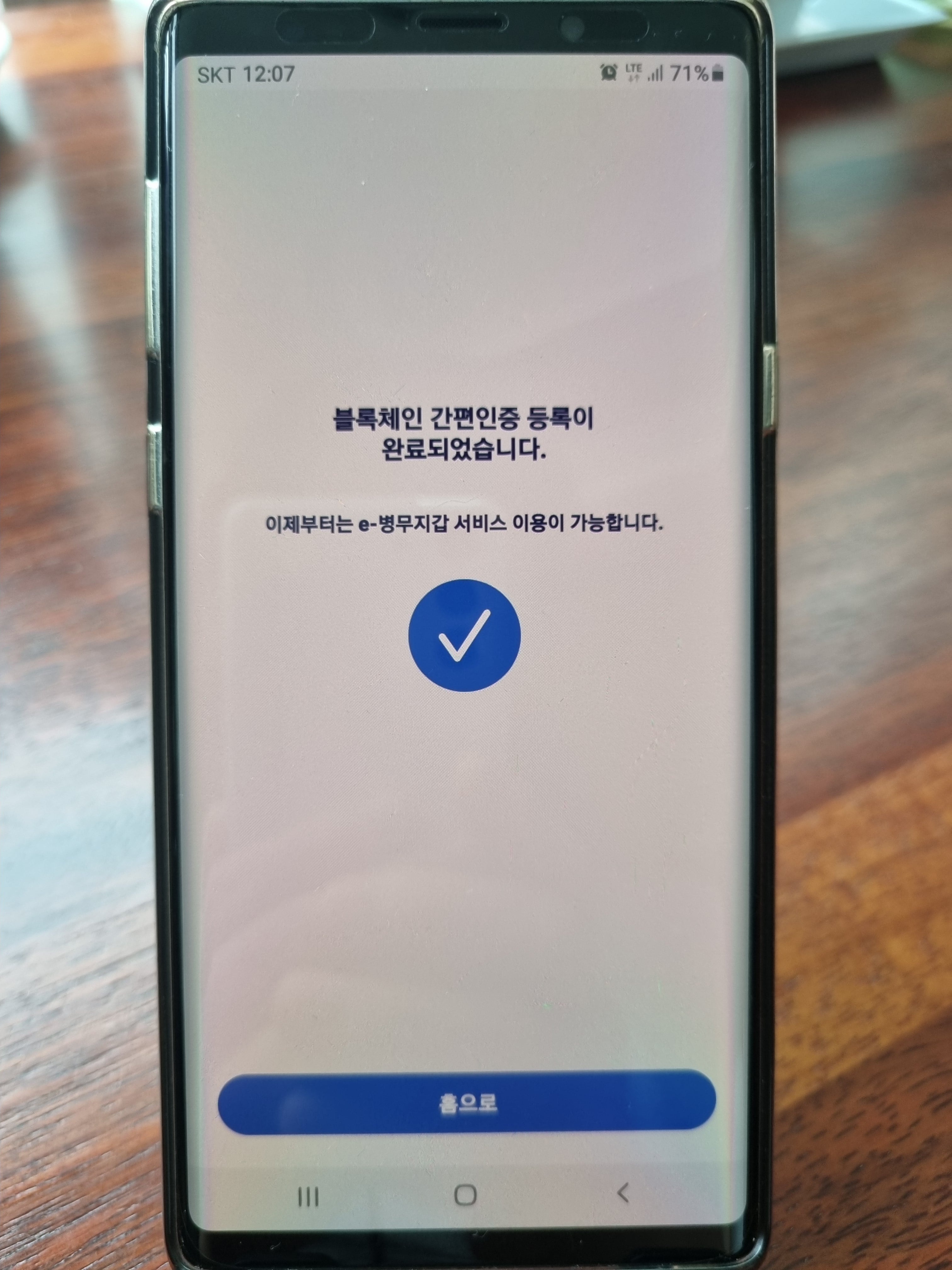 휴대폰을 통한 본인인증이 완료되면 핀번호 6자리를 입력하고 '입력완료'룰 눌러 주세요. 다음 생체인증은 지문인식으로 '다음에 하기'를 눌러 넘어가 주세요. 그러면 바로 블록체인 간편 인증이 등록이 완료되고 이제부터 e-병무 지갑 서비스를 이용할 수 있습니다.