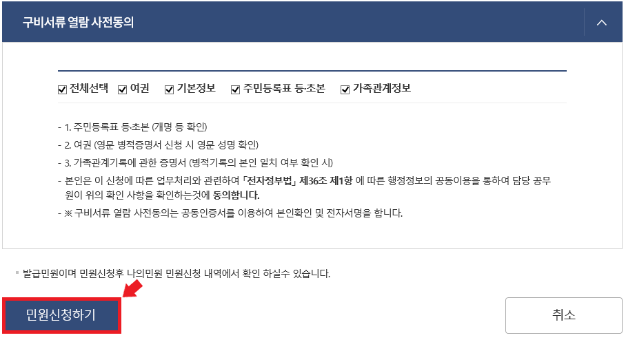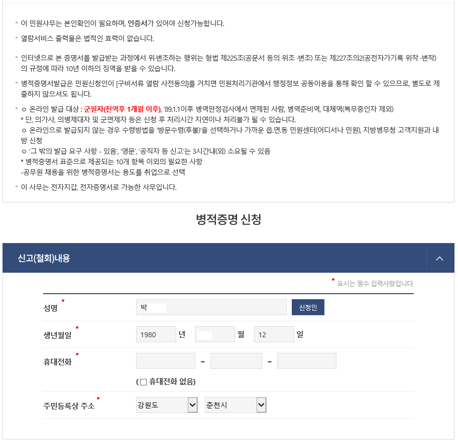 정부 24 병적증명서를 신청하기 위한 신고내용, 병적증명서 신청 내용, 수령방법, 구비서류 열람 사전 동의 등 입력 및 선택을 하여 주시고 내용에 이상이 없다면 아래 '민원 신청하기'를 눌러 주세요.