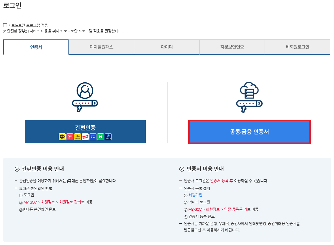 정부 24 민원서비스를 이용하기 위해서는 PC 또는 이동식 디스크에 저장되어있는 인증서로 '간편 인증', '공동·금융인증서'를 선택 후 로그인을 진행하여 주세요. 정부 24에 인증서가 미등록되어있다면 인증서 등록 후 민원 서비스를 이용할 수 있습니다. 저는 공동(구 공인인증서)·금융 인증서를 선택하고 로그인을 진행하도록 하겠습니다.
