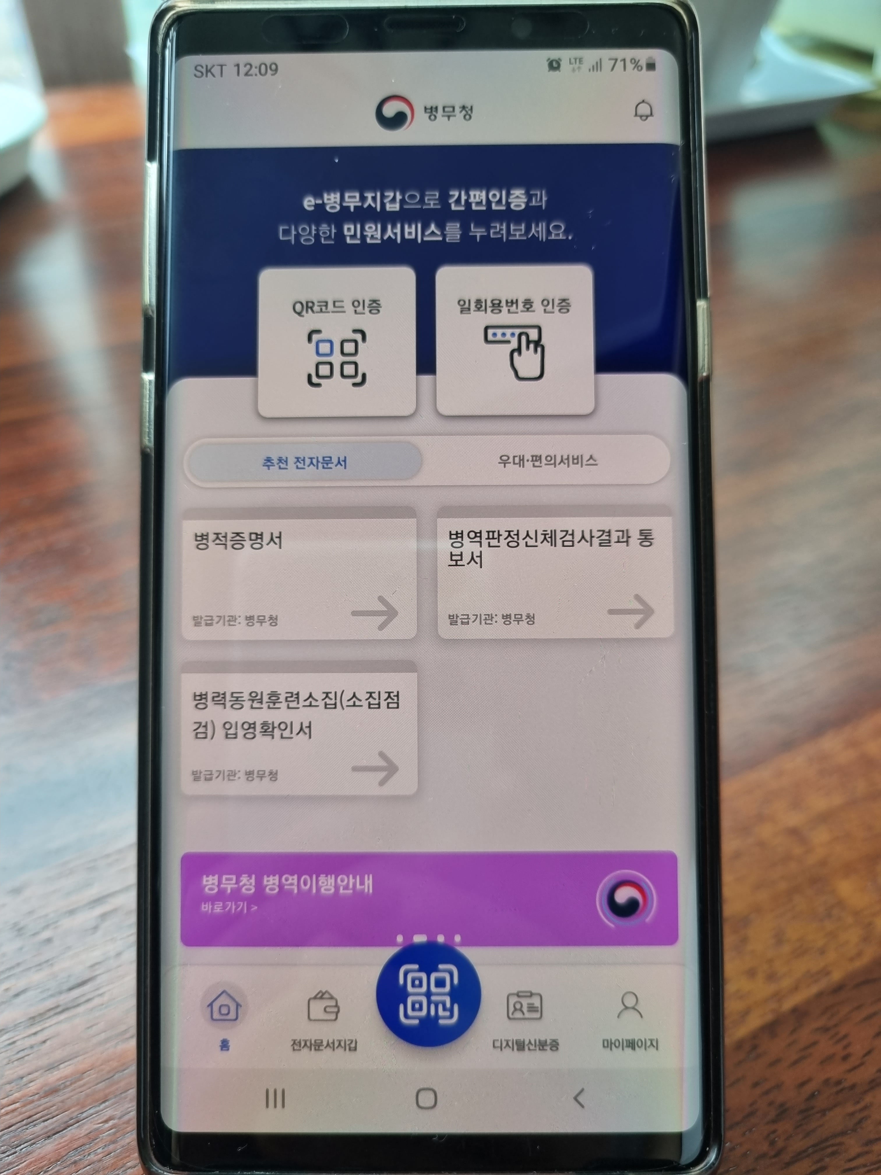 모바일을 통한 e-병무 지갑 메인 화면입니다. 중간에 보이는 '병적증명서'를 눌러 주세요.