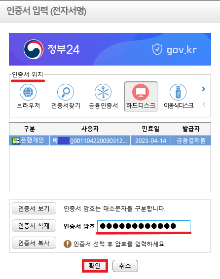 저장되어 있는 인증서의 위치를 선택하고, 인증서 암호를 입력한 다음 '확인'을 눌러 주세요.