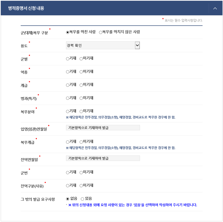 병적증명서 발급대상은 병역준비역(만 18세), 보충역, 대체역, 예비역, 전시근로역, 병역면제 및 퇴역된 사람, 여성으로서 지원에 의해 현역 복무를 마친 사람이 신청하여 발급받을 수 있습니다. 다만, 현역 복무 중인 장교, 부사관은 병적증명서 발급 제외 대상으로 복무 중인 부대에서 복무확인서를 발급하여야 하며 현역 복무 중인 병은 입영사실 확인 용도로 병적증명서 발급이 가능한데요.