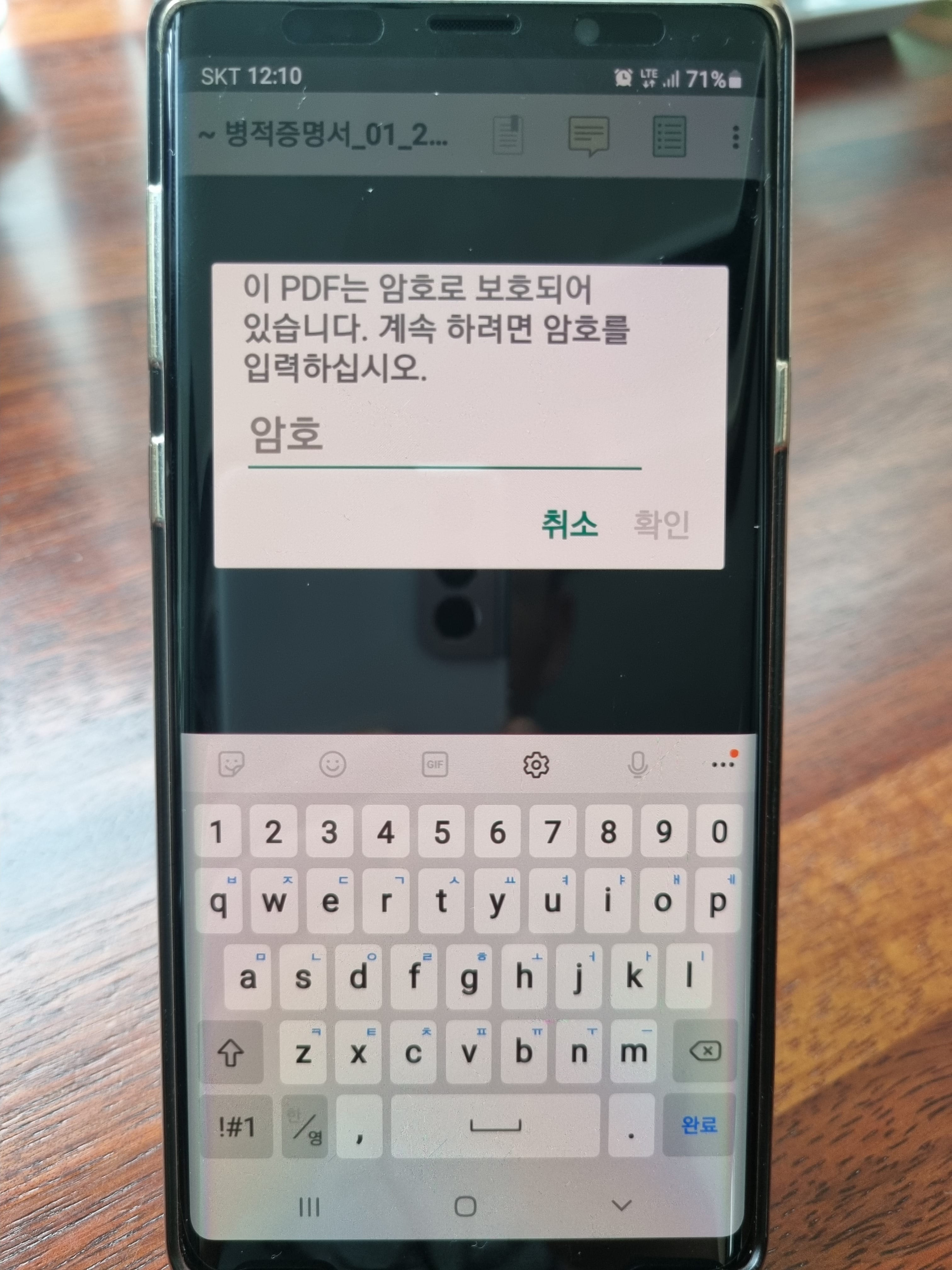 병적 증명서 문서(PDF)를 열람하기 위해 본인의 생년월일 앞자리 (예:19901201)를 입력 후 '확인'을 눌러 주세요.