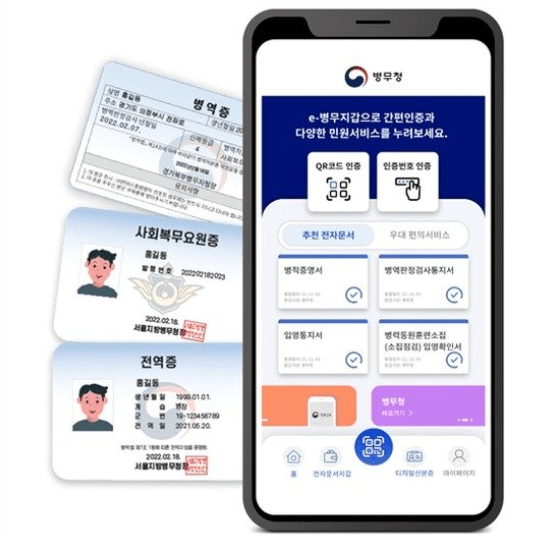 e-병무 지갑이란? 불록 체인 간편 인증 서비스를 기반으로 전자문서 지갑 서비스, 디지털 신분증 발급, 병역이행자 우대·편의 서비스를 이용할 수 있는 민원 서비스인데요. 병무청은 스마트폰 앱으로 제공되는 개인 맞춤형 병무민원 서비스 'e-병무 지갑'을 개통하여 병적증명서와 전역증, 사회복무요원증, 각종 통지서 등 병역 이행 관련 전자문서 28종과 모바일 신분증을 스마트폰에서 발급받을 수 있습니다.