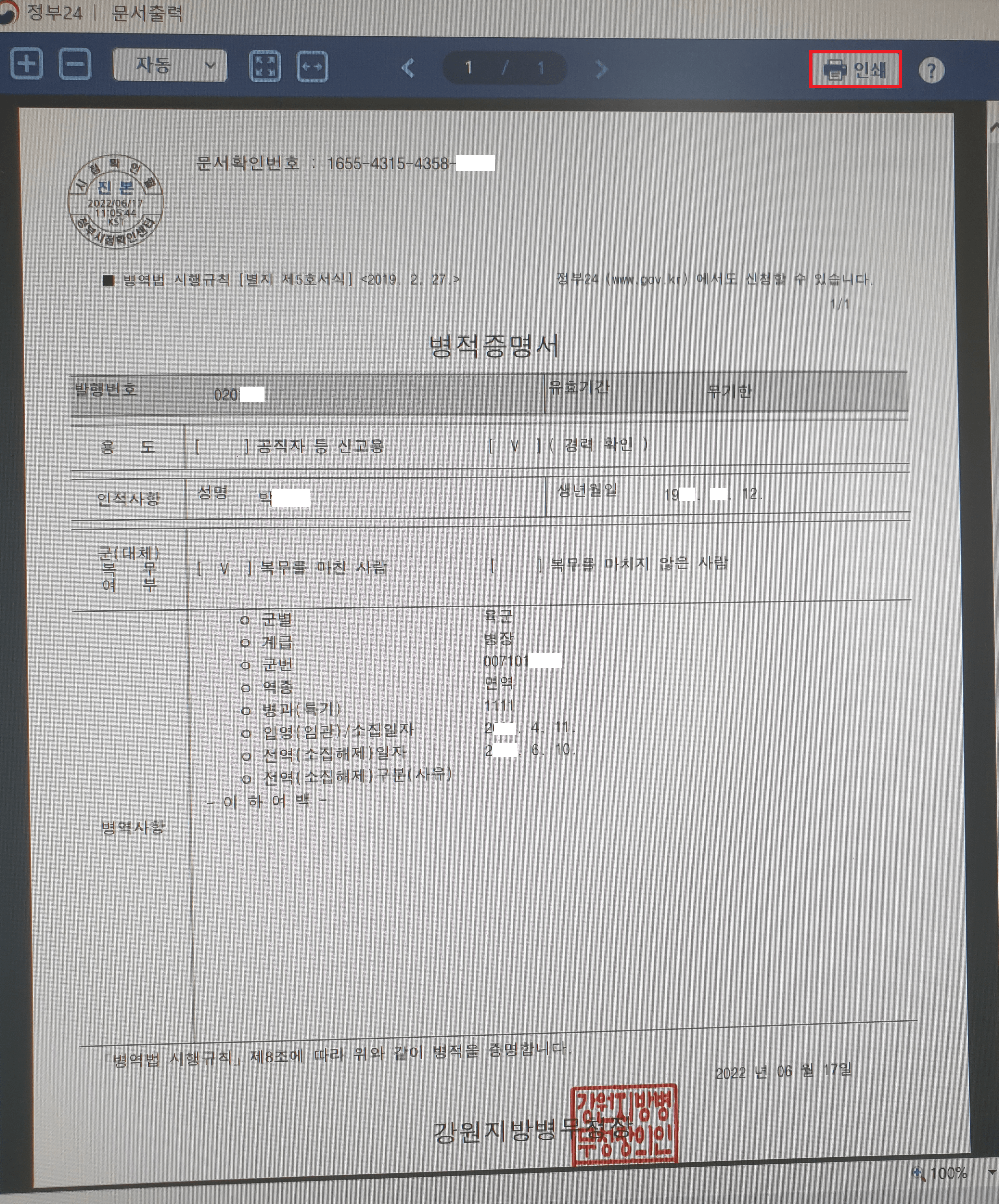 우측 상단에 보이는 '인쇄' 버튼을 누르면 병적증명서 인터넷 발급이 완료됩니다.