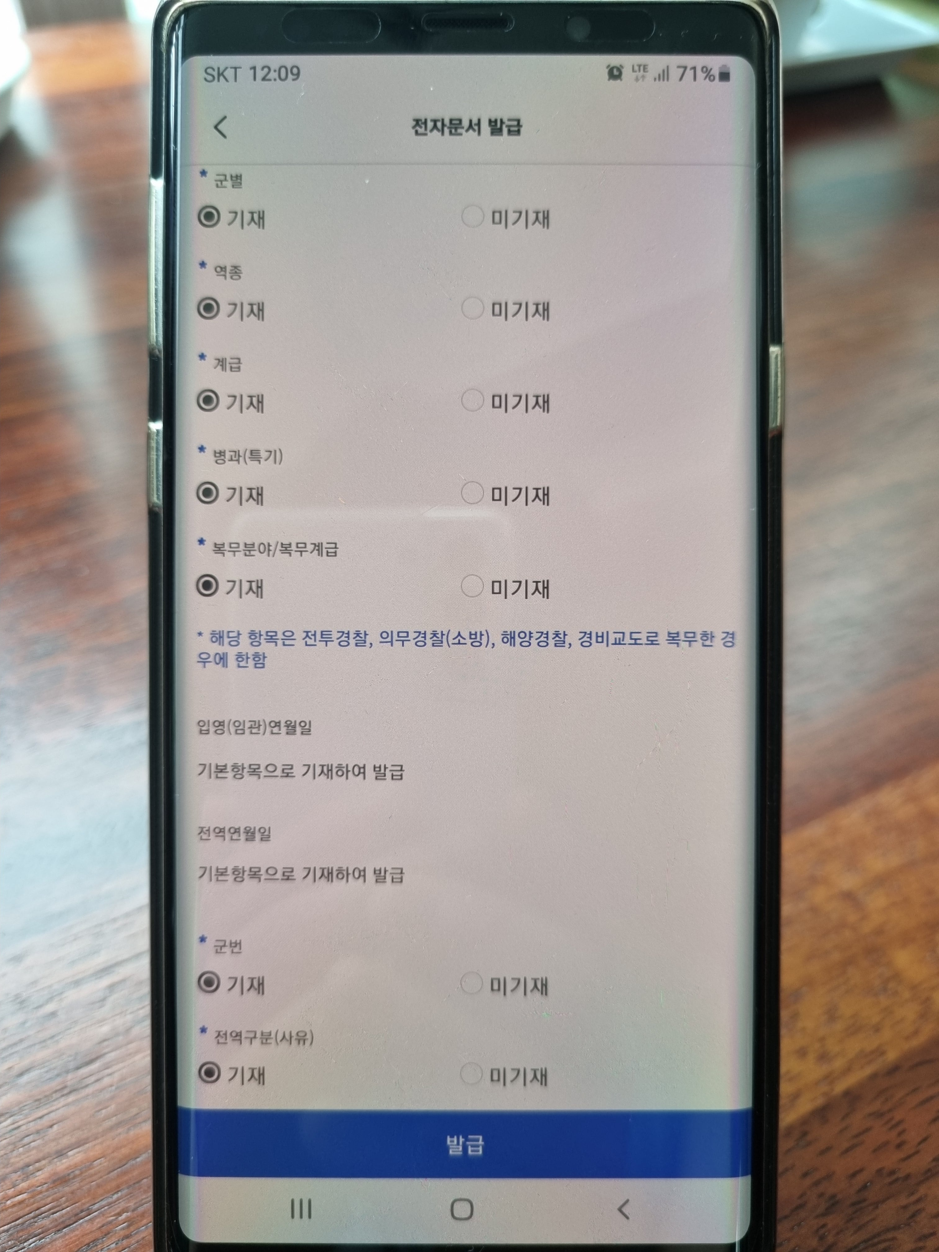 전자문서 발급을 위해 증명서 제출 용도, 주민등록상 주소, 군 경력 및 기타, 병적증명서 신청 내용(군별, 역종, 계급, 병과, 복무분야), 군번, 전역 구분(사유) 등을 기재/미기재를 선택하고 '발급'을 눌러 주세요.