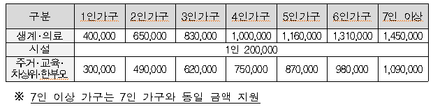 ㅇ 긴급 생활지원금 지원금액 : 급여자격별, 가구원수별 차등지급(1회 한시 지급), 생계·의료급여 수급 1인 가구에게 40만 원을 지급, 2인 가구 65만 원, 3인 가구 83만 원, 4인 가구는 최대 100만 원, 5인 116만 원 식으로 가구원이 많을수록 지급 금액이 높아집니다. 보장시설 수급자는 1인 20만 원이 지급됩니다.