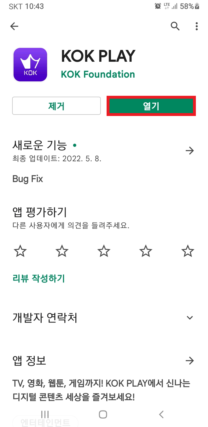 2) 구글 플레이스토어 검색창에 'KOK' 또는 'KOK PLAY'를 입력하고 설치를 진행해 주세요. 설치가 완료되면 '열기'를 눌러주세요.