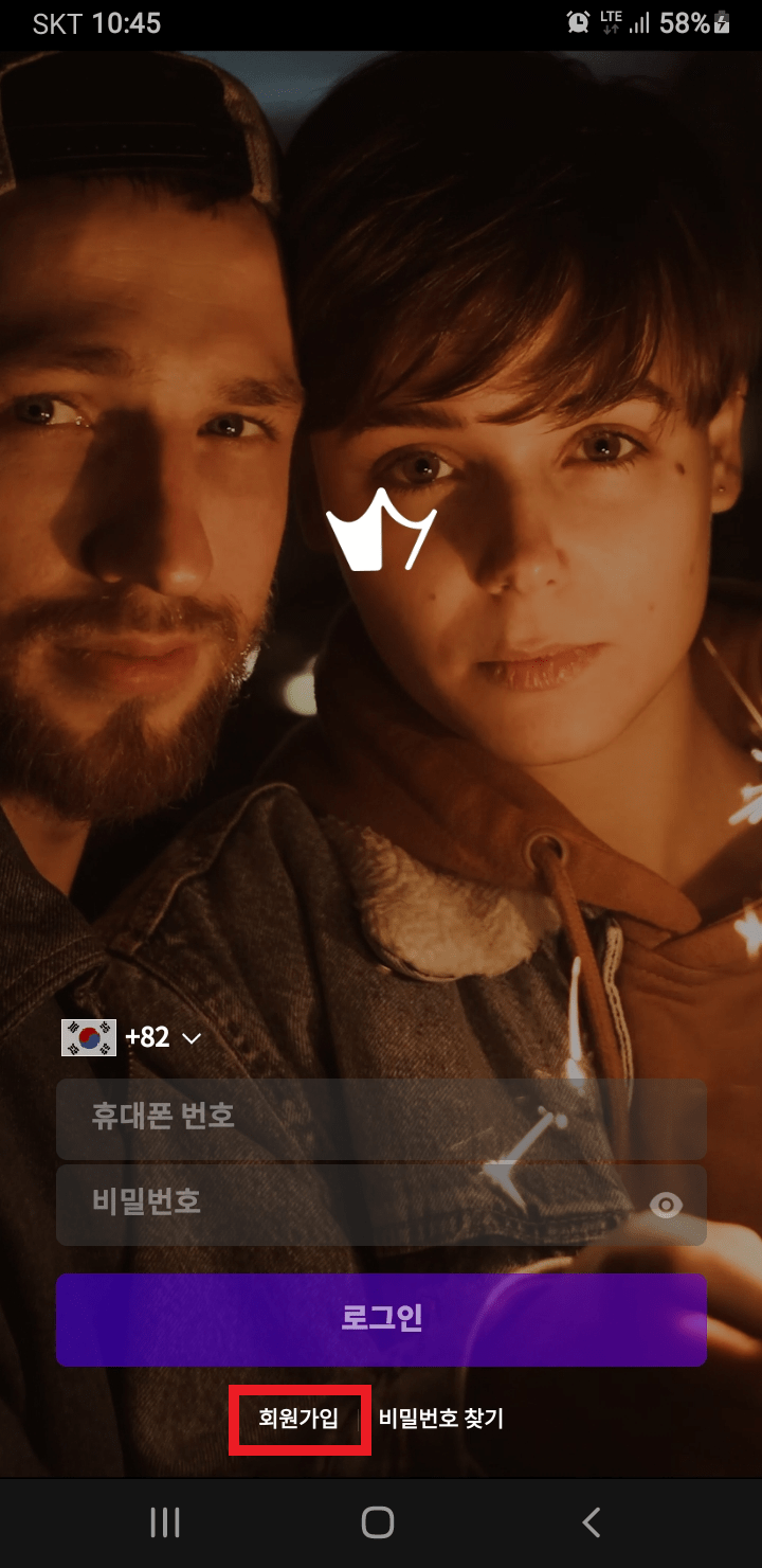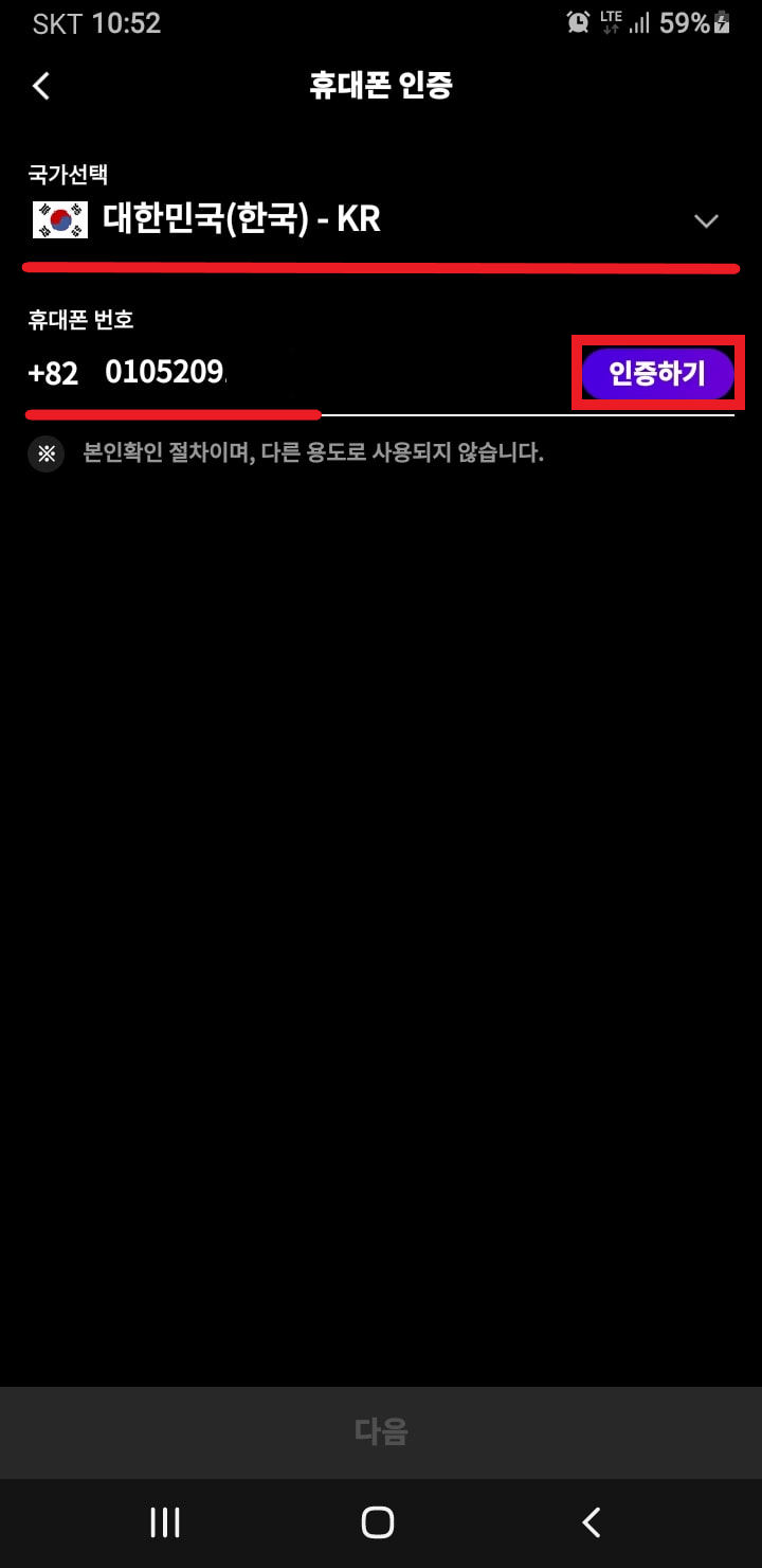 4) 휴대폰 인증 화면으로 살고 있는 '국가'를 선택하고 '휴대폰 번호' 입력 후 '인증하기'를 눌러 주세요.