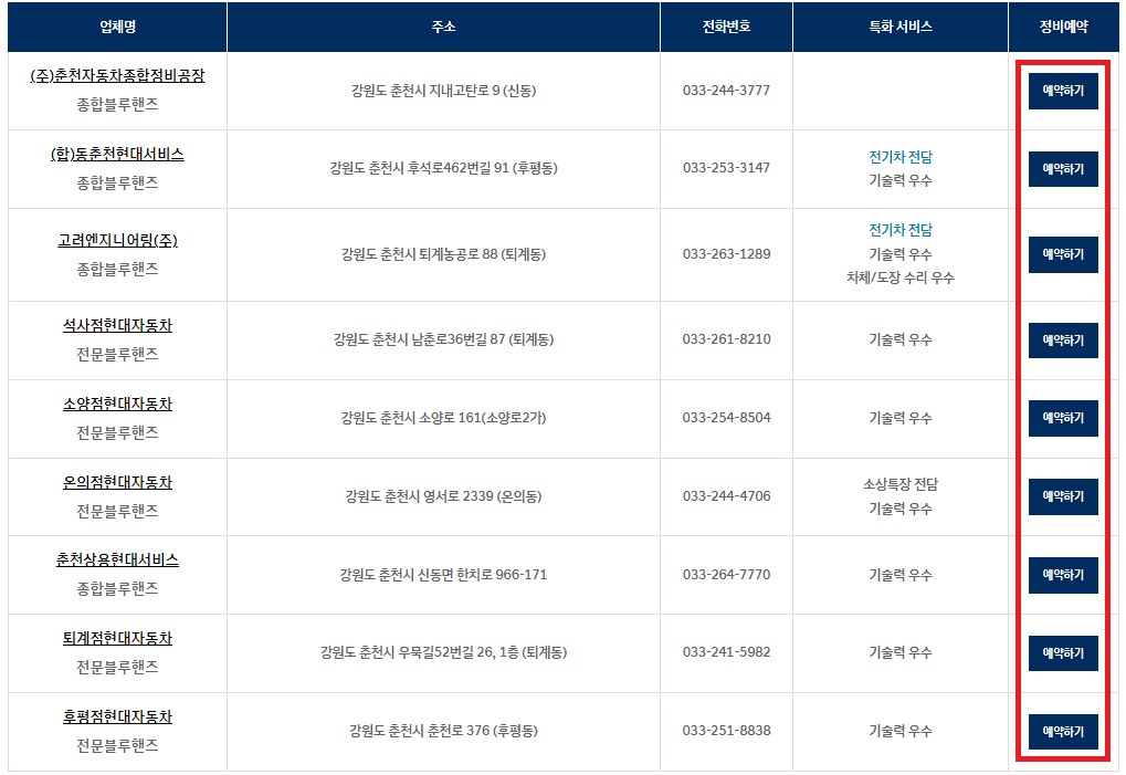 검색 후 정비 예약이 가능한 현대자동차 서비스센터 직영점, 블루핸즈 정비소를 확인이 됩니다.