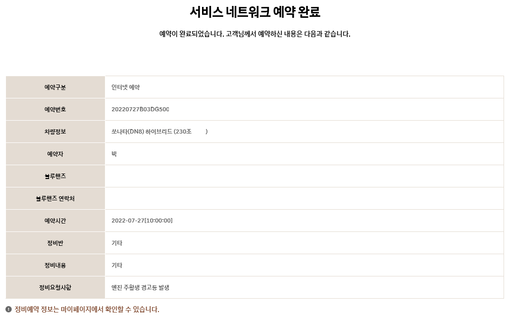 인터넷을 통한 현대자동차서비스센터 예약이 완료됩니다.