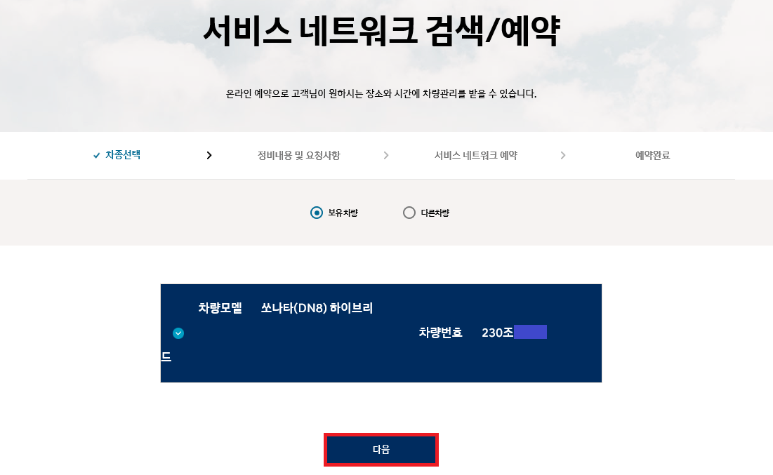 로그인이 완료되면 정비를 받을 차량 모델과 차량번호를 확인 후 '다음'을 눌러 주세요.