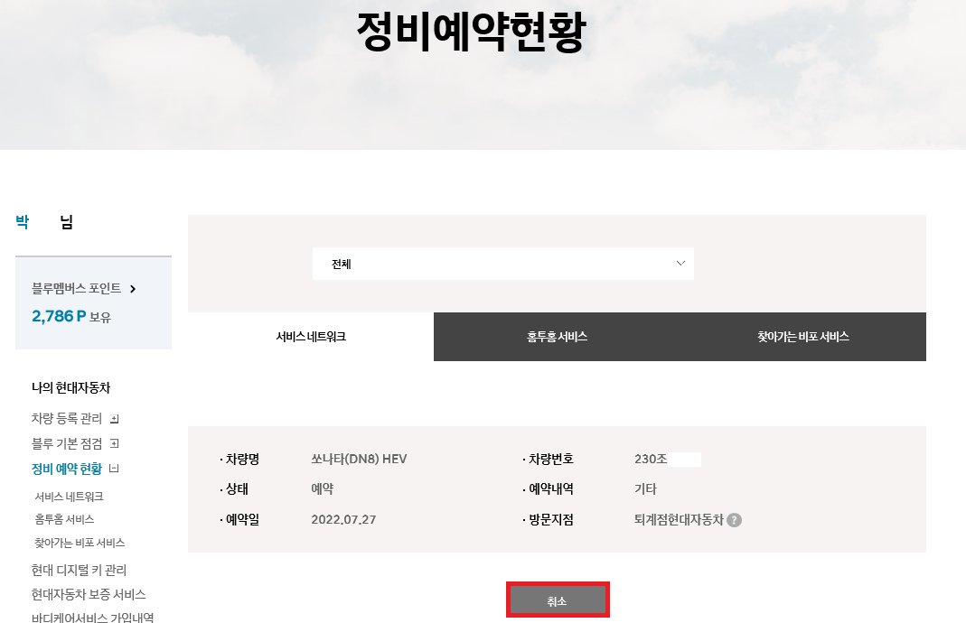 혹시 예약을 잘못한 경우 취소해야 한다면 방법도 알려드리겠습니다. 마이페이지 → 나의 현대자동차 → 차량 점검 및 서비스 → 정비 예약 현황에서 '취소'를 눌러주면 예약이 취소 완료됩니다.