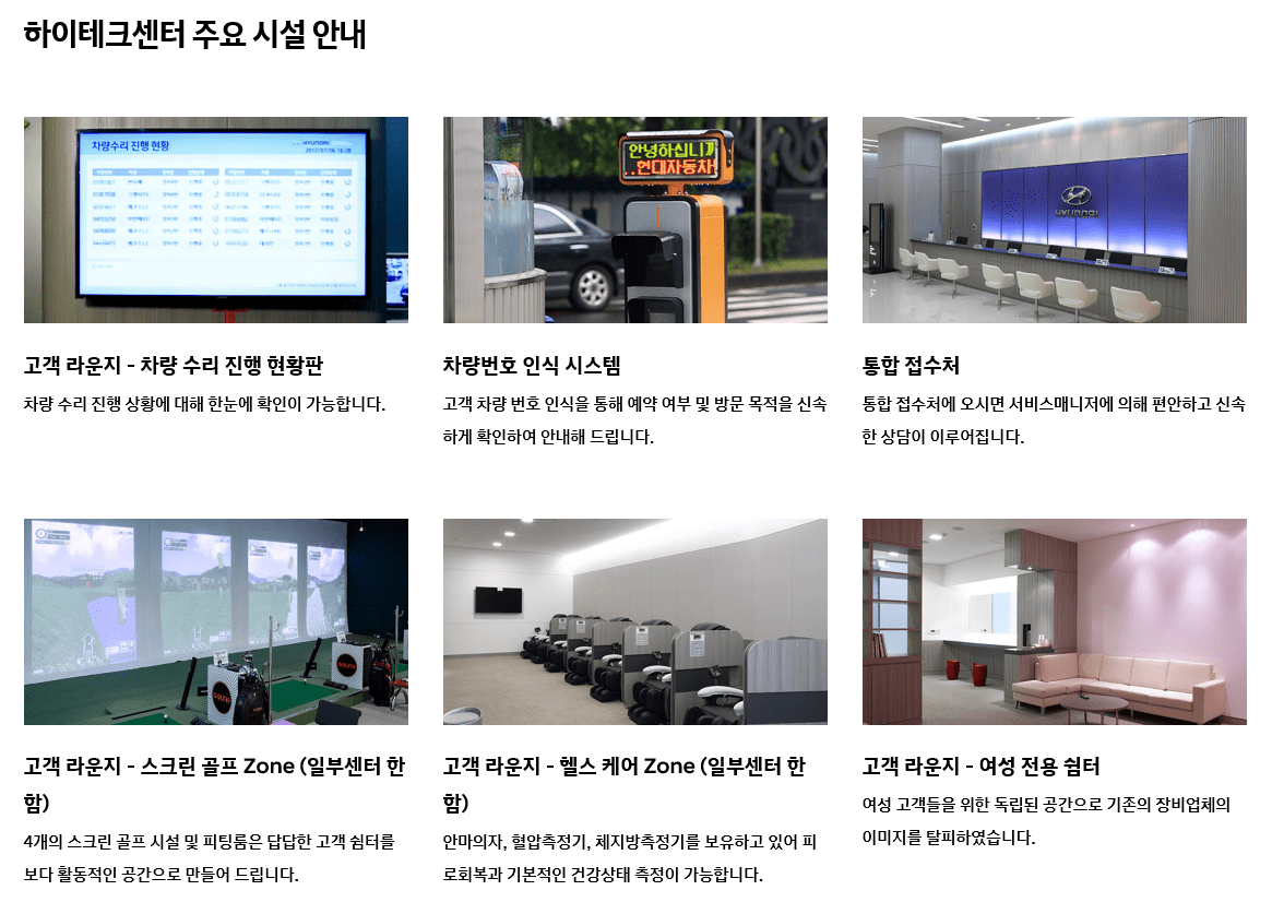 직영점(하이테크센터) 정비 서비스 항목 : 보증수리 및 일반 정비가 가능한 현대자동차 직영 정비 거점(단, 일부 차종의 경우 시설/장비에 따라 일부 서비스가 제한될 수 있으니 사전 문의해주세요.)
