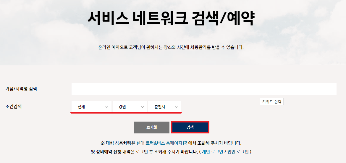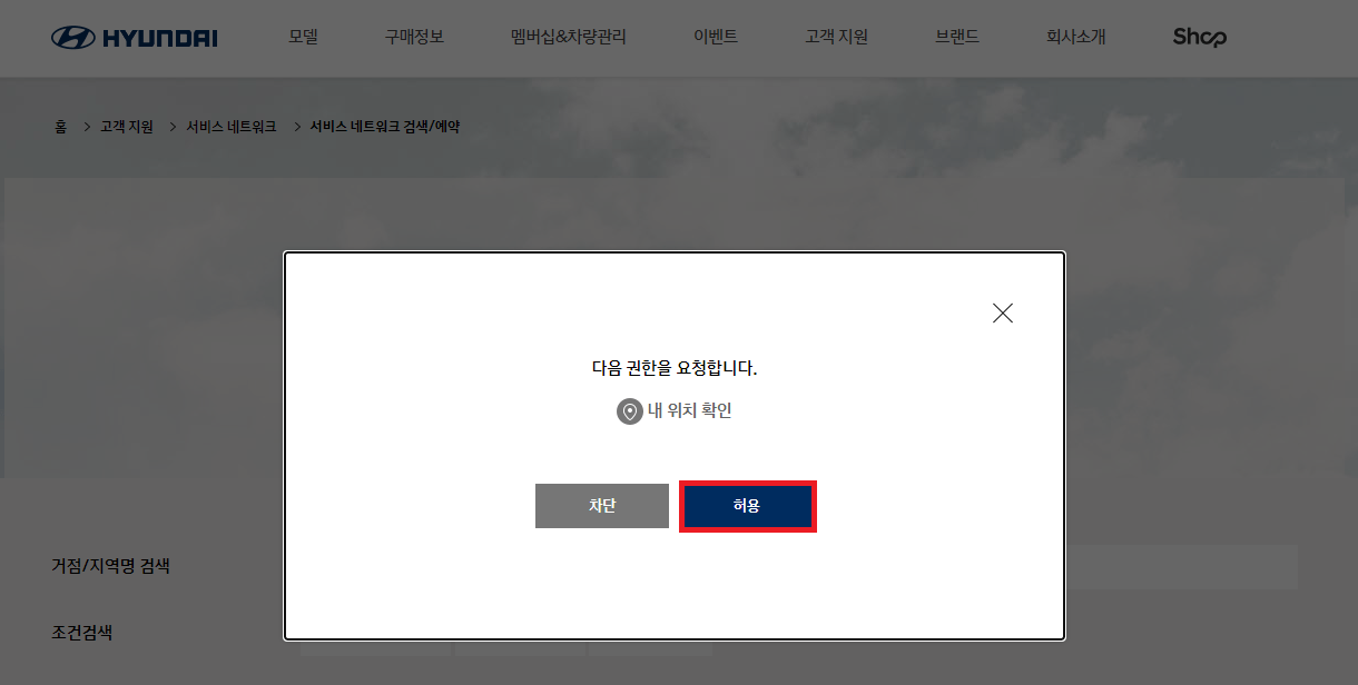 현대자동차 서비스 네트워크 검색/예약 페이지입니다. 권한 요청 팝업 창에서 내 위치확인을 하기 위해 '허용'을 눌러 주세요.