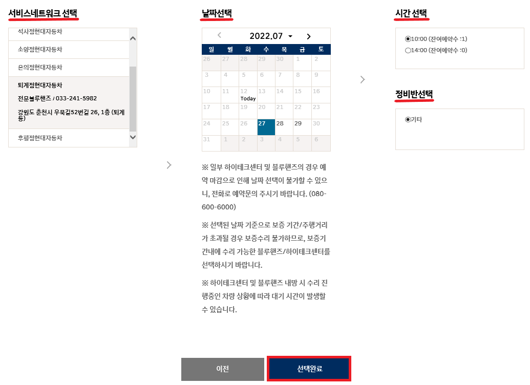 서비스 네트워크 선택에서 정비를 받을 '직영점' 또는 '블루핸즈' 선택 → '날짜 선택' → '시간선택' → '정비반선택' →'선택 완료'를 눌러 주세요.