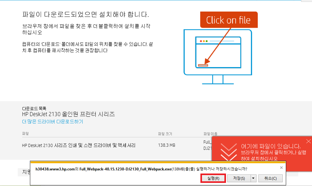 프린터 파일을 실행하고 저장하시겠습니까? 팝업창이 뜨면 '실행'을 눌러 주세요. 프린터 설치가 진행됩니다.