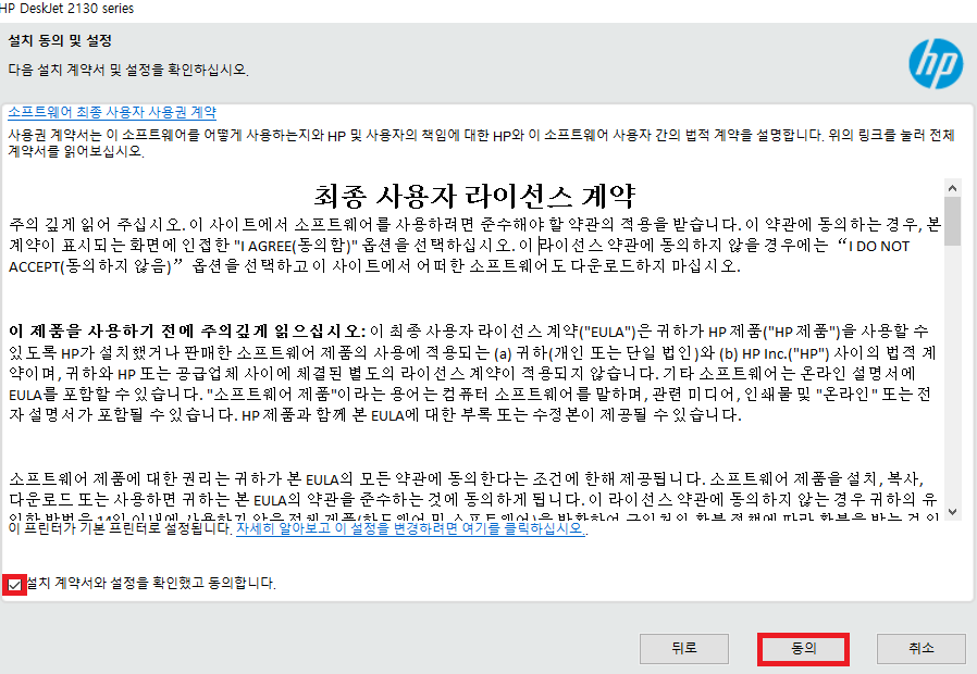 소프트웨어 최종 사용자 사용권 계약 동의에 □ 체크를 해주시고 '동의'를 눌러 주세요.